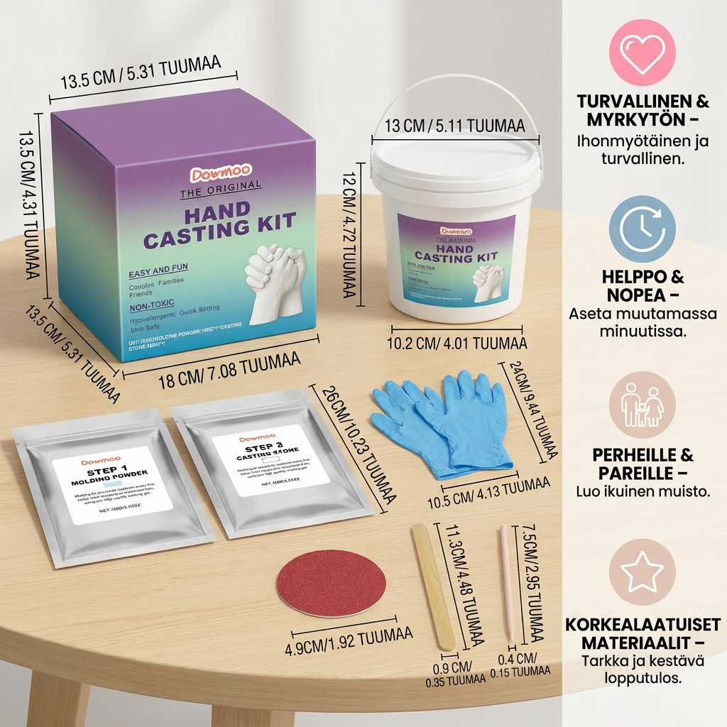 Perheille ja pareille tarkoitettu kädenjälkisarja on täydellinen tapa tallentaa elämän arvokkaimmat hetket. Tämän innovatiivisen 3D-kipsisen muistoesinesetin avulla voit säilyttää yhteenkuuluvuuden, rakkauden tai ilon hetken ainutlaatuisena kädenjälkenä. Se sopii erinomaisesti pareille, perheille tai ystäville, jotka haluavat luoda pysyvän muiston erityisestä hetkestä.