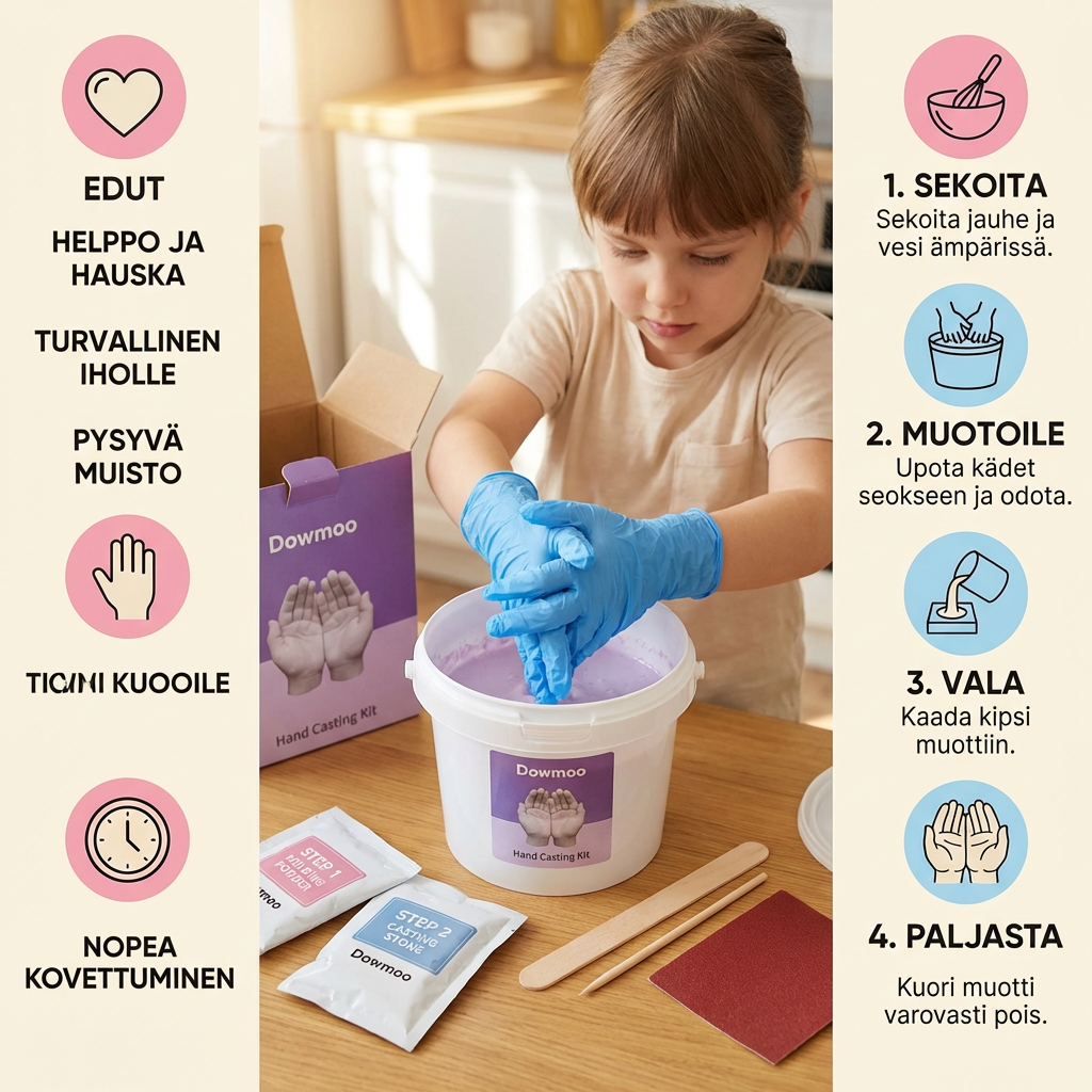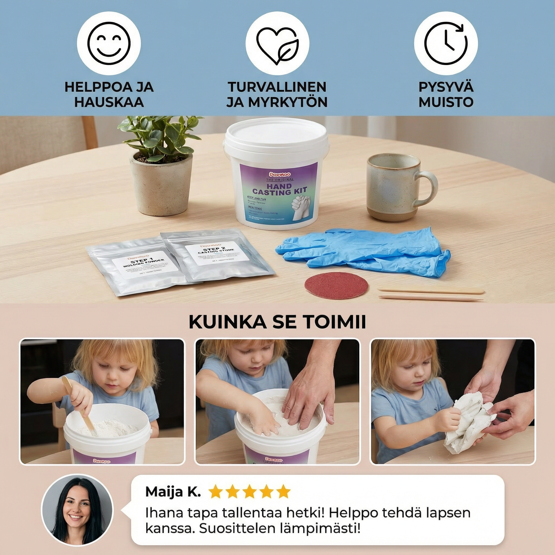 Joskus juuri pienet hetket tekevät elämästä erityisen. Olipa kyseessä lahja tai henkilökohtainen muisto sinulle ja perheellesi, kädenjälkisarja auttaa säilyttämään hetken niin, että voit palata siihen yhä uudelleen. Kipsijäljennös ei tarjoa vain elävää muistoa tästä erityisestä hetkestä muodon ja ulkonäön kautta, vaan kantaa myös tunnearvoa vuosien ajan.