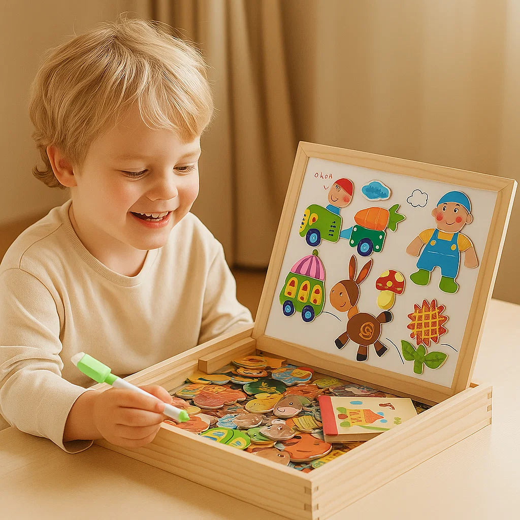 Hyvästi aivottomalle ruutuajalle ja tervehdys käytännön löytöretkelle. Tämä magneettinen palapelitaulu antaa lapsille mahdollisuuden oppia muotoja, parantaa koordinaatiota ja ilmaista mielikuvitustaan ilman puhelinta tai tablettia. He keskittyvät ja viihdyttävät itseään ja kehittävät samalla kriittistä ajattelua ja ongelmanratkaisutaitoja - kaikki tämä leikin avulla, joka tuntuu hauskalta, ei kotitehtävältä.